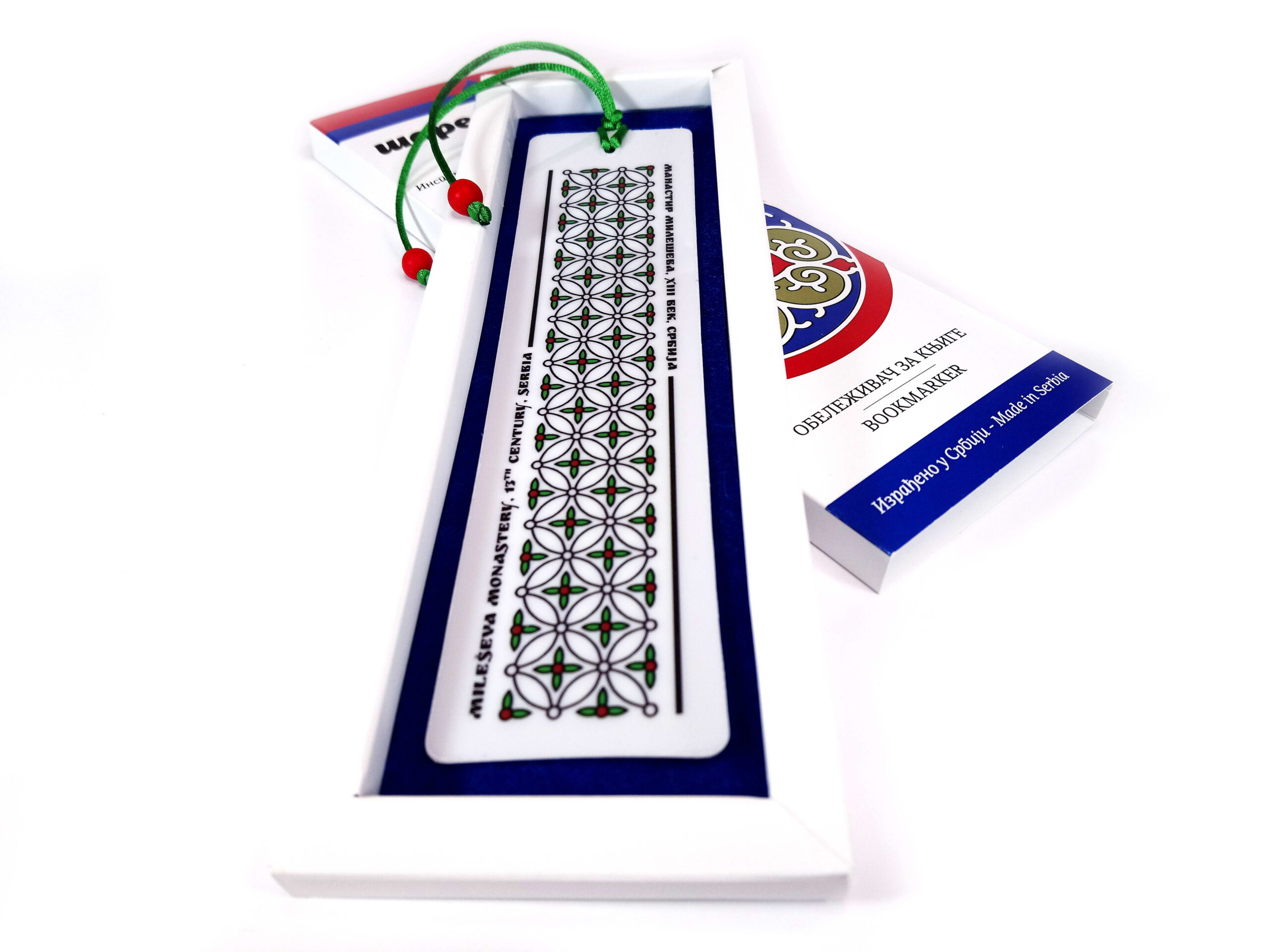 Obeleživač za knjige izrađen je od fine vrste plastike, poznate pod skraćenim nazivom APET (amorfni polietilen tereftalat), a odlikuje je velika fleksibilnost i glatka sjajna tekstura. Na vrhu obeleživača nalazi se svilena vrpca sa akrilnom perlicom na svakom kraju. Motiv sa obeleživača deo je ornamentalnog ukrasa iz fresko-slikarstva manastira Mileševe i potiče iz dalekog XIII veka. Na prednjoj strani obeleživača, tehnikom direktne UV štampe, nanesen je sam ornament, a na zadnjoj strani je ispisan tekst, na srpskom i engleskom jeziku, o poreklu ornamenta. Slova i linije naglašene su mat lakom. Kutijica u kojoj se obeleživač nalazi napravljena je od finog kunstdruk papira, ima dno obloženo filcem, a na njenoj poleđini nalazi se kratka priča o Mileševi. Obeleživač za knjige je savršen poklon za ljubitelje knjiga i poštovaoce dobrog dizajna koji prkosi vekovima, a predstavlja i mali podsetnik na lepotu i bogatstvo srpskog kulturnog nasleđa. Od prve do poslednje faze izrade, obeleživač je napravljen u Srbiji.