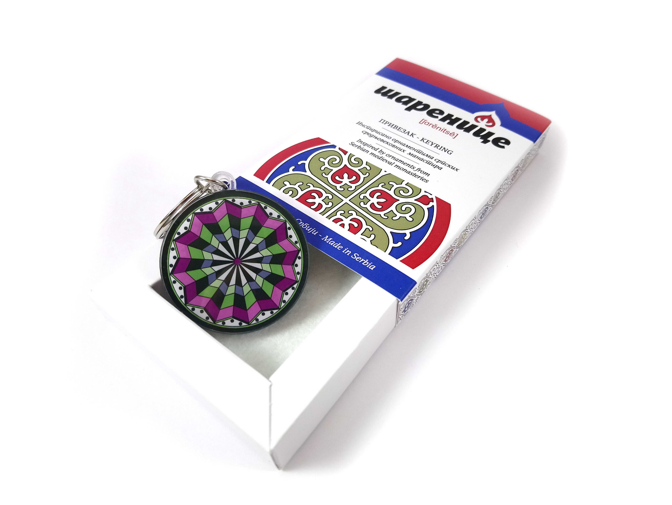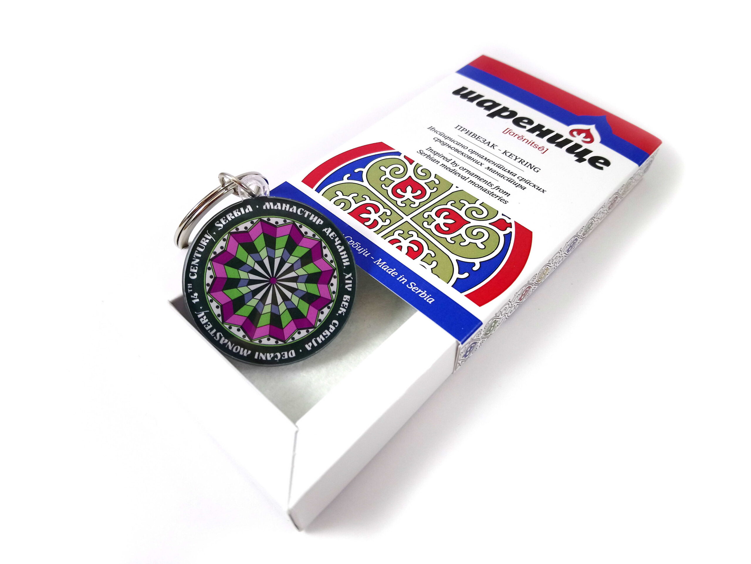 Privezak za ključeve izrađen je od prozirnog klirita i ima alkicu od niklovanog metala. Motiv na privesku deo je ornamentalnog ukrasa iz fresko-slikarstva manastira Dečana i potiče iz dalekog XIV veka. Na jednoj strani priveska, tehnikom direktne UV štampe, nanesen je ornament, dok je na drugoj strani oko ornamenta kružno ispisan tekst – na srpskoi i na engleskom jeziku – koji govori o njegovom poreklu. Privezak od klirita dolazi u dva različita pakovanja – na kartončiću od finog kunstdruk papira i u poklon kutijici od istog papira, sa filcanim dnom. Od prve do poslednje faze izrade, privezak je napravljen u Srbiji.