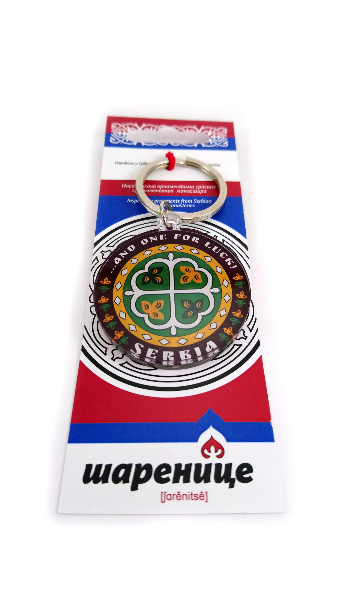 Привезак за кључеве израђен је од прозирног клирита и има алкицу од никлованог метала. Мотив на привеску део је орнаменталног украса из фреско-сликарства манастира Студенице и потиче из далеког XIII века. Привезак од клирита долази у два различита паковања – на картончићу од финог кунстдрук папира и у поклон кутијици од истог папира, са филцаним дном. Од прве до последње фазе израде, привезак је направљен у Србији.